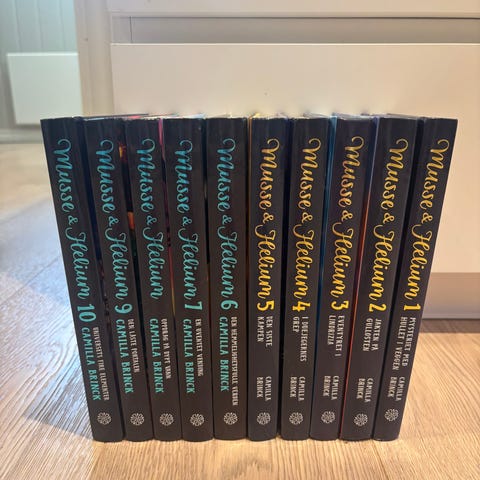 Musse & Helium bind 1-5 med titlene: Mysteriet med hollet i veggen, Jakten på gullosten, Eventyret i Lindrizia, I duejegernes grep, Den siste kampen. Selges samlet for 250.