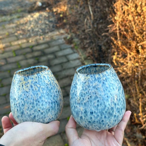 Keramisk tekanne med lokk, signert på undersiden. Tekannen har en rund form med en tut og håndtak, dekorert i blått og grått glasur. Egnet til servering av te.
