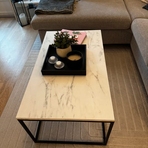Øland sofabord frå Bohus. Kvitolja eikefiner med fiskebeinsmønster. Nypris kr 5 999. Bordet er brukt sidan 2021, men er i god stand.