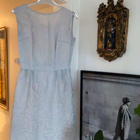 Nydelig skreddersydd cocktaildress / selskapskjole og sjal med frynser fra 50-tallet. Tror sjalet er silkefóret. Arvegods, som har vært i mitt eie i over 30 år, men aldri har vært brukt av meg. Ser helt ubrukt ut, som ny! Det var vanlig å bruke kjoler som dette i bryllup og cocktailparties på 50-tallet. Isblå farge, best fargegjengivelse på bilde 4.