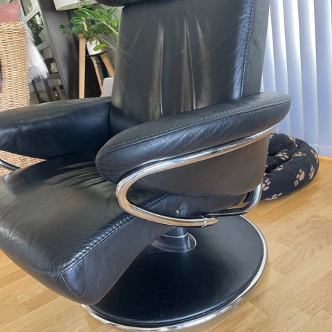 Pent brukt recliner med krakk selges. Kjøpt på Jysk, ligner på modell Tankedal som Jysk selger nå til 3.500,- forskjellen er at dette er imitert skinn