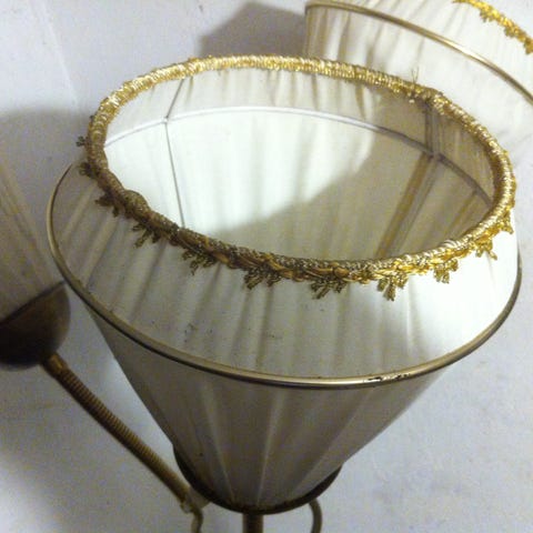 Skjermene er trukket om i sateng og fått nye pyntebånd.