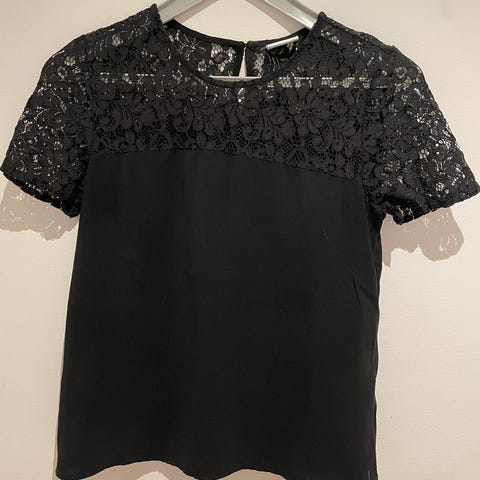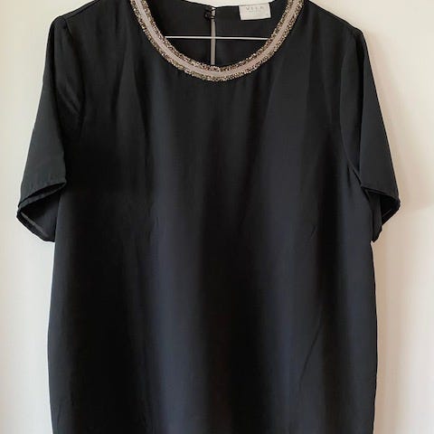 Langermet svart chiffon-topp fra Vila. Veldig anvendelig, like fin til bukser som skjørt. Materialet gir en lett og elastisk passform.