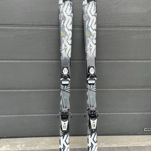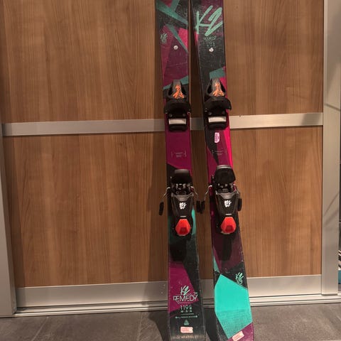 K2 Pinball Pro twintip alpinski med lengde på 115 cm. Skiene har bindinger og er designet for alpinski. Fargene på skiene inkluderer blå, grønn og svart.