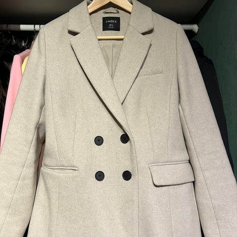 Lindex jakkei beige farge, størrelse M for dame. Laget av ull med resirkulert ullblanding. Jakken har to knapper og lommer på sidene, med foret innside. Lite brukt. Jakken er stor i størrelsen til å være M, en oversized modell som kan brukes opp til størrelse 44/46.