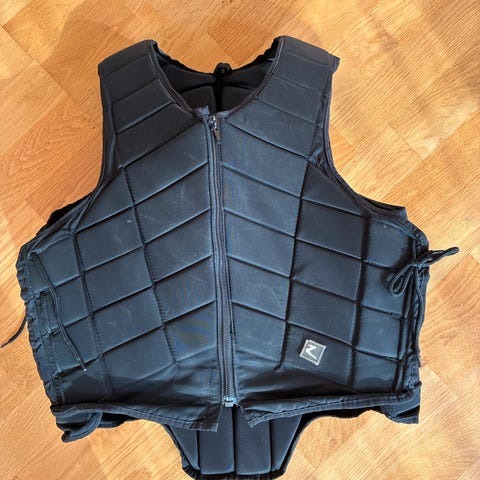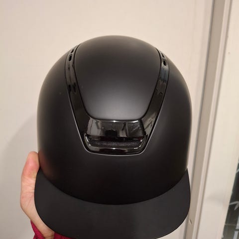 FOUGANZA Ridehjelm i svart farge med brune skinn detaljer. Hjelmen har STR.54. Brukt av 1 jente i 3 år.