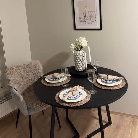 Spisebord i marmor med fire svarte fløyelstoler selges. Nesten ikke brukt, bare stått til pynt.