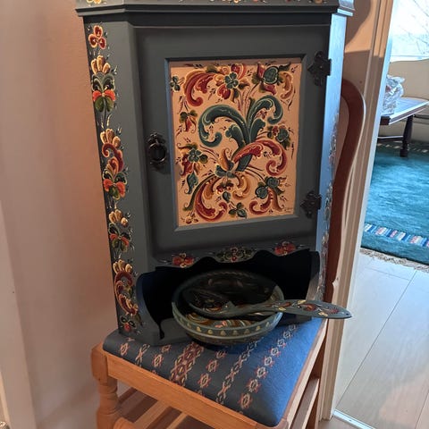 Ønsker å kjøpe rosemalt hjørneskap som vist på bildet, helst malt av Per Aarhus, Årekol, eller noen andre. Betaler markedspris + for fint skap i topp tilstand. Også interessert i andre antikviteter som kjenge, ølbolle, osv. Ta kontakt om noe skal selges 🙂