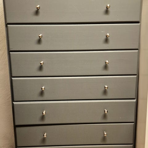 Fire skuffer. Den øvste kan låsast. Nøkkel følgjer med.
