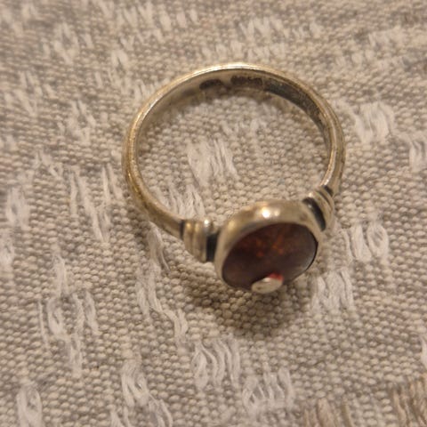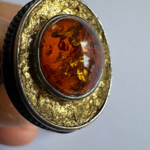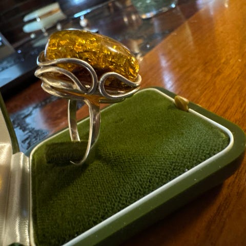 Rav og sølv unisex ring med en lang oval ravstein festet i en sølvinnfatning. Ringen har et enkelt og tidløst design, egnet for både menn og kvinner.