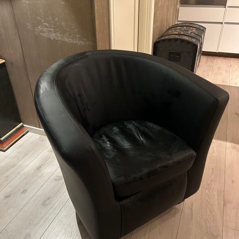2 lenestoler med puffer i skinn selges