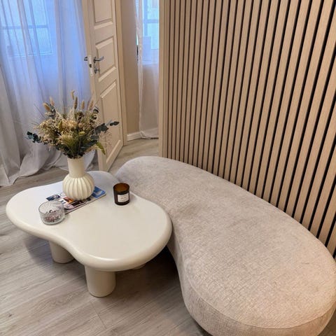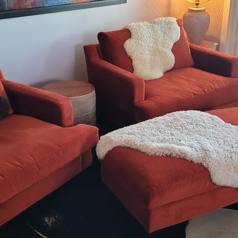 Sofa, lenestol, tre puffer og stuebord selges samlet for kr 12.000,–.