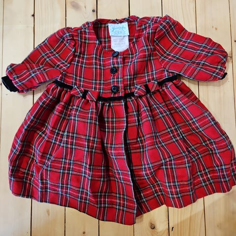 Kun brukt en gang: Rød Varm Baby-Kjole for jente i størrelse 62. Kjolen har et rutemønster i rødt og svart med hvit krage, og er laget av bomullsmateriale som gir komfort.