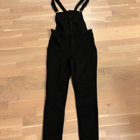 H&M blå jumpsuit for kvinner i størrelse M. Laget av polyester. Plagget har en dyp V-utringning og er designet med smale skulderstropper. Egnet for ulike anledninger.