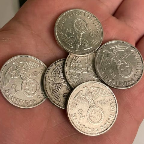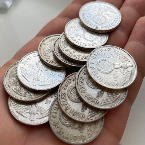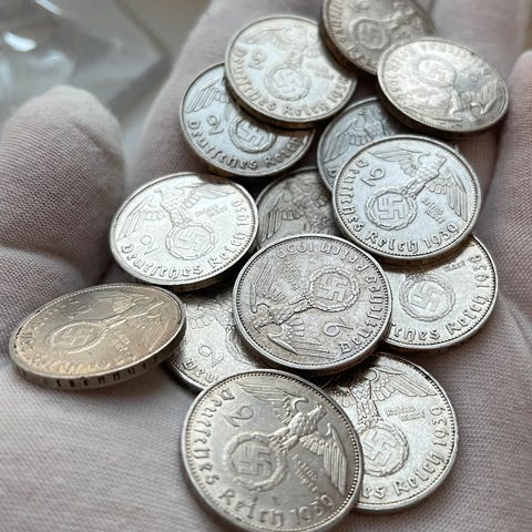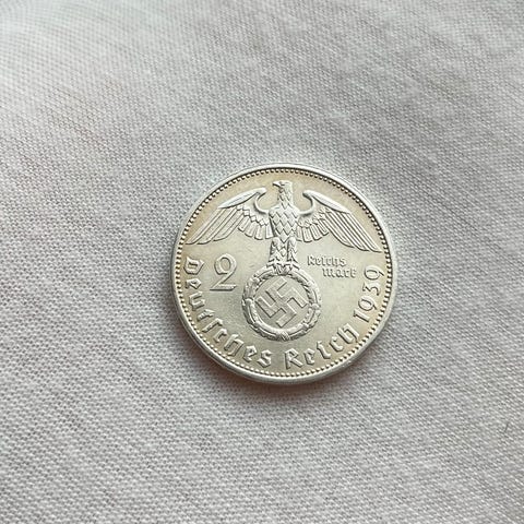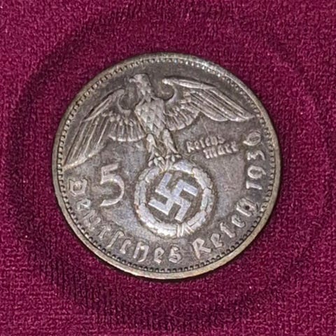 Tyskland 5 Reichsmark mynter fra 1938 laget av 0.900 sølv . Diameter på 29 mm og vekt på 13,88 gram. Mynter med motiv av Paul von Hindenburg og tysk ørn med hakekors.