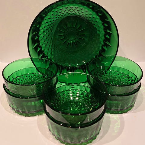 Sjeldent vakkert og velholdt vintage grønt sett med totalt 6 skåler og 4 asjetter av samme type.