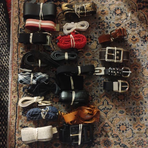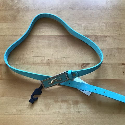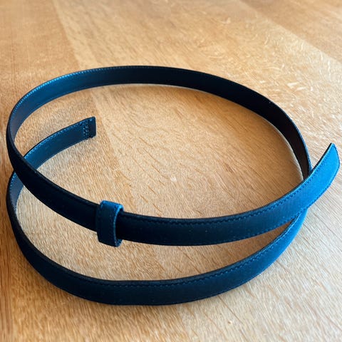 Beltene er av stoff. Det turkise er 3 cm og det blå 1,8 cm bredt.