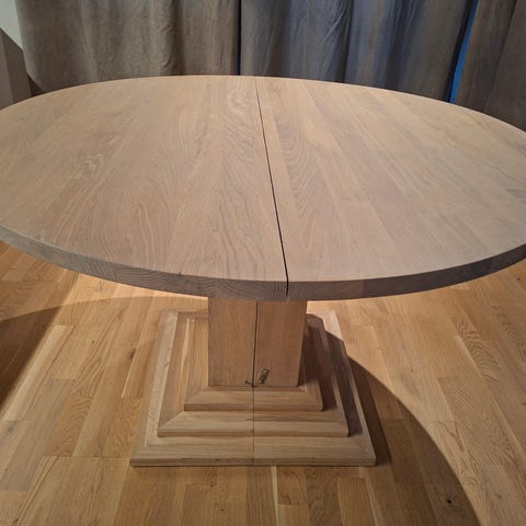 Nova Solo. Ashton Ø 135 cm-435 cm. Rundt spisebord med 6 tilleggsplater. Røkt Eik. Ny pris 34995.- Bordet er ca 8 mnd gammelt og pent brukt. Kun en av tilleggsplatene er brukt 1 gang. Resten ligger uåpnet i eske.Må hentes.