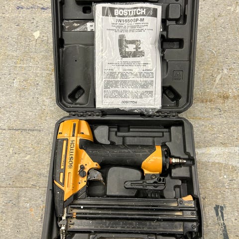 Bostitch N89RH17-2MCN spikerpistol med tilhørende kasse. Verktøyet er brukt og har synlige bruksmerker.