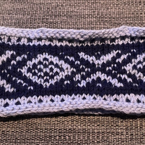 Strikket pannebånd ca str xa-s. Passer fint til en ung dame/jente. Pannebåndet er strikket i merinoull (Double Sunday fra Sandnes garn). Ubrukt. Kan sendes som brevpost etter avtale.
