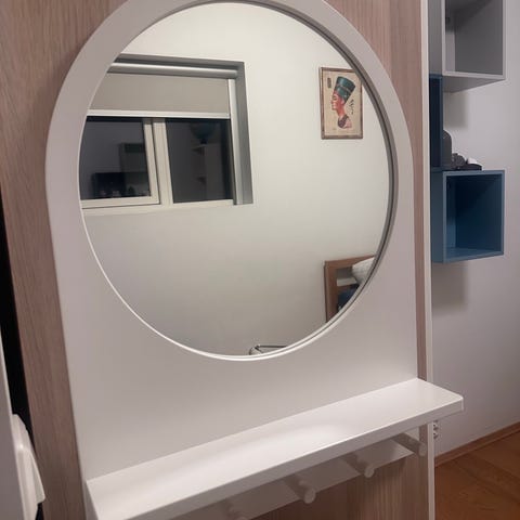 IKEA speil med svart ramme og dekorative detaljer. Speilet har en støtte for å kunne stå oppreist på flat overflate. Egnet for bruk som dekorativt speil i hjemmet.