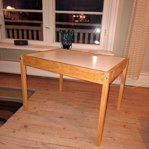 Grei stand på bordene, stol kan bytte trekk på, tegnemerker på lekebordet.
