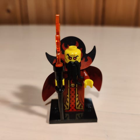 LEGO DC Minifigur av Aquaman med gul hud, brun hårstil, brun bukse og en trefork som tilbehør. Figuren står på en svart baseplate.