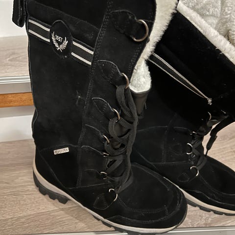 Dr. Martens støvler i størrelse 42, laget av svart skinn. Støvlene har en klassisk design med snøring og gummisåle, egnet for både hverdagsbruk og mer robust bruk.