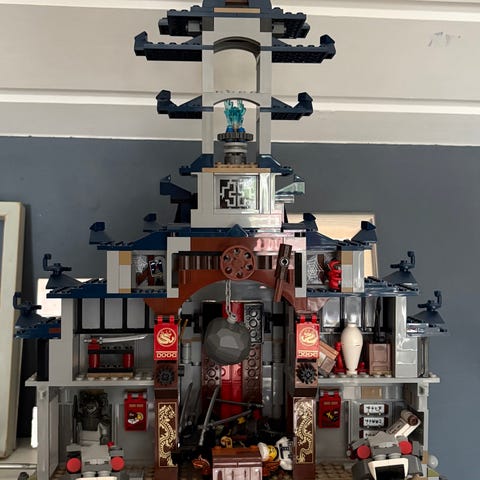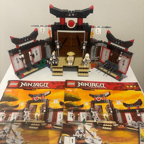 LEGO NINJAGO byggesett som forestiller et tempel med flere detaljerte elementer og minifigurer. Settet inkluderer arkitektoniske trekk som tårn og dekorative symboler, samt tilbehør som bidrar til lek og samling. Passer for fans av LEGO NINJAGO-serien. Kommer også med alle figurene, brosjyren og esken. Setter er helt komplett.