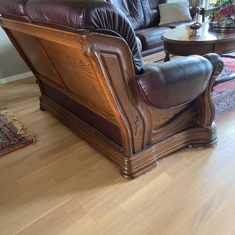 2 stk skinnstoler, fantastisk gode å sitte i. Skinnstoler med tre på rygg og sider. K Må hentes på Ålgård