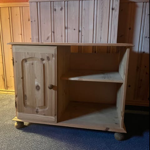 Eike skap men lys inni. Står ute klar til henting. Er tungt.