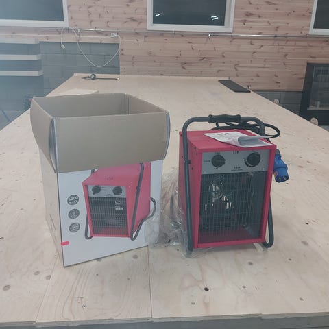 Lite brukt og god kvalitet. Bærehåndtak, rustfrie stålrørselementer, romtermostat med innstillingsområde 5-35°c og effektvelger for halv og hel effekt. Kapslingsgrad ipx4. 510m3/t luftmengde