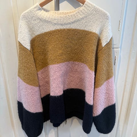 Pen genser fra Acne Studios i størrelse M. Genseren har en grå farge med flerfargede striper og er i et tynt, delikat strikket stoff. Meget pent brukt. Hentes på Torshov. Heis. Buss 20 og 30 stopper rett utenfor.