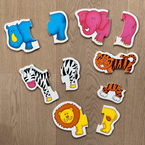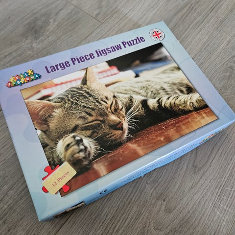 Puslespil i tre med 5 katter. Hver katt sammensett av 3 deler. Deler pusles i tilhørende kattehus, katter kan pusles i forskhellige varianter.