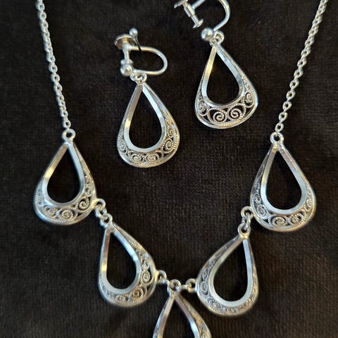 Armbånd og øreringer i oksidert, kraftig sølv.