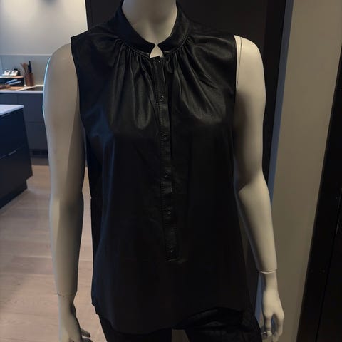 Haust skinntopp/ festtopp i str S. Myk skinn på fremsiden og stretchig stoff på ryggskaden. God passform og exclusiv look. Veldig fin. Et par bittesmå spots på, men syns ikke i bruk.