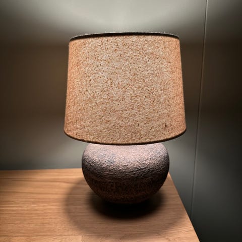 Rustikk bordlampe med varmt lys (varmere enn det som kommer frem med mobilkamera). Gir veldig koselig stemning i rommet.