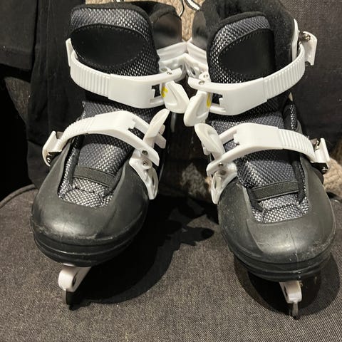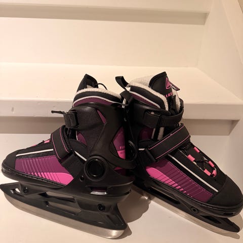 Barneskøyter for ishockey, størrelse 27, i hvit og lilla farge. Skøytene har justerbare stropper og er egnet for barn.