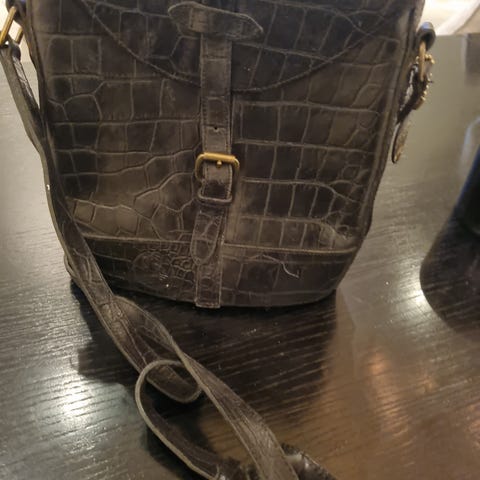 Vesken er pent brukt med normal slitasje etter alder, særlig langs kanter og rem, noe som gir karakter uten å gå på funksjon. Alle spenner og sømmer er hele.