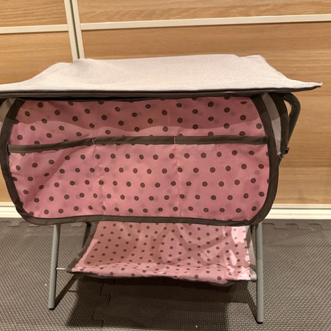 Baby born stellebord for barn med rosa kant, hvit polstret overflate med fargerike mønstre, og treben. Egnet for stelle- og bleieskift barnelek.