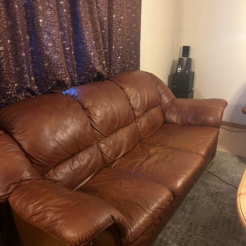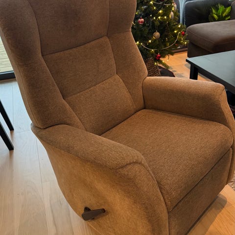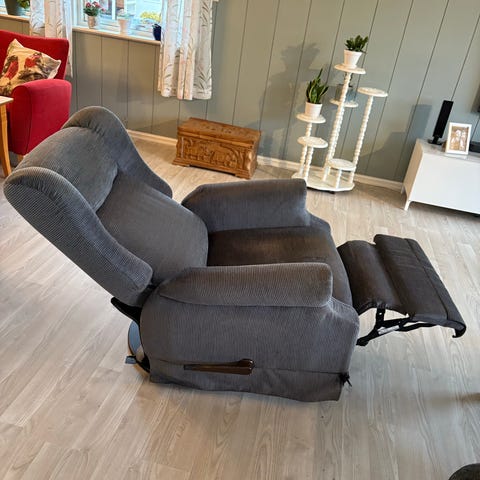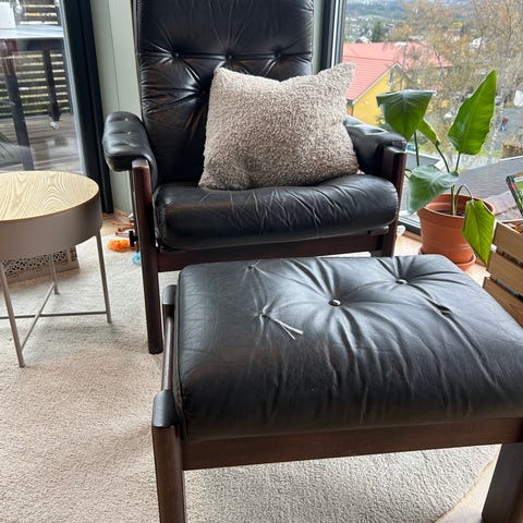 Stilig og behagelig lenestol - som vipper bakover med tilhørende fotskammel. Litt slitt i overflaten enkelte steder, så den trenger litt kjærlighet.