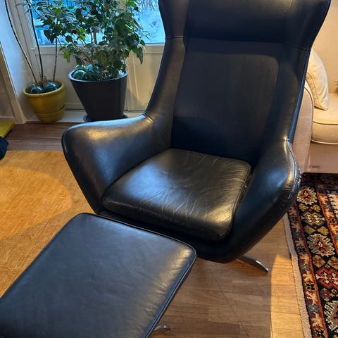 Fin svart lenestol i skinn eller sky med fotskammel
