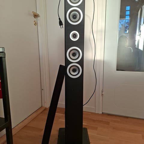 Høyttaleren har dock-tilkobling (eldre iPod/iPhone-type) og leveres med strømadapter (se bilde).
