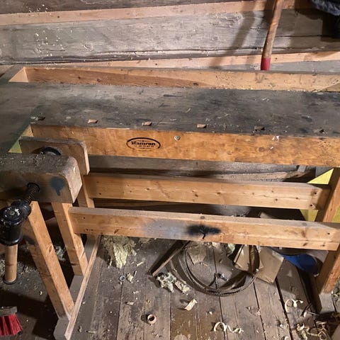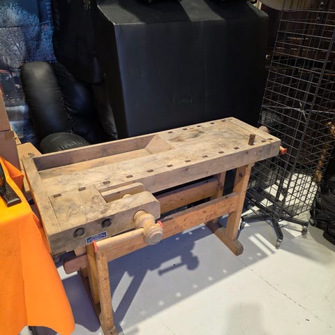 Verkstedbenk i tre med skrustikke på siden. Benken viser tegn på bruk og har slitasje på overflaten. Egnet for håndverks- og reparasjonsarbeid som krever fastspenning av materialer.