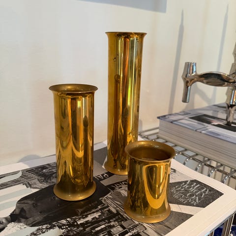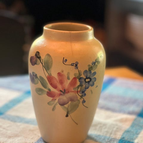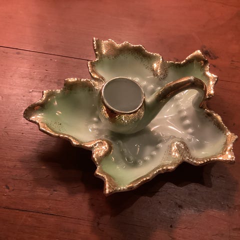 Retro askebeger igrønnfarge med gulldekor. Det har fast pipe. Kjempefint, men har dessverre en knekt bit. Se siste bildet.