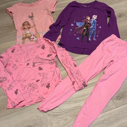 Litt anmerkninger, men mye bruk igjen. En bukse er hel og pen, men mangler litt av glitteret på knærne. Den andre buksa har litt mørkere områder på knær/rumpe, en bitteliten flekk og et lite hull. Tskjorten mangler et par "perler" og har et lite hull. Genseren har litt slitasje på trykket.