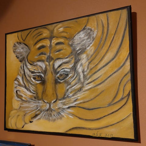 Oljemaleri som viser et motiv av en gepard i bevegelse. Malt på treplate.
