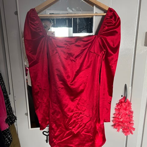 Vero Moda festkjole i størrelse M, farge rød, laget av polyester. Kjolen har et elegant design med rynkedetaljer og midtlange ermer. Egnet til formelle anledninger og fester.
