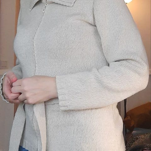 Varm genser i 100% ull. Kragen kan åpnes og lukkes med knapper. 2 lommer foran. Størrelse XS-M