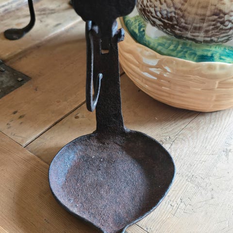Antikk håndsmidd peistang, i jern, meget spesielt og håndlagd, 53,5 cm